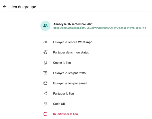 La même page d’info contient des options qui permettront de copier et d'envoyer un lien d’invitation à rejoindre le groupe ==> Ce lien pourra être diffusé à toute la communauté dans le groupe « je vais voler » ou par mail ou par tout autre outil Les partants s’ajouteront et recevront les notifications relatives à cette seule sortie. Les autres membres de la communauté ne recevront rien |
